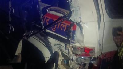 पटना में हाईवा ने पुलिस गाड़ी को मारी टक्कर, रेलिंग से टकराकर लगी आग