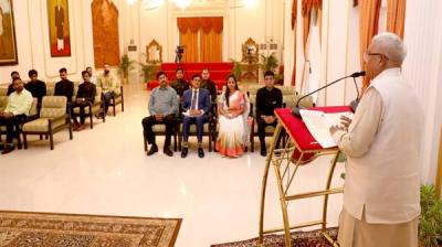 भोपाल : राज्यपाल मंगुभाई पटेल से बुधवार को लोकभवन में भारतीय विदेश सेवा के प्रशिक्षु अधिकारियों ने सौजन्य भेंट की। राज्यपाल पटेल का पौधा, शॉल, श्रीफल और स्मृति चिन्ह भेंट...
