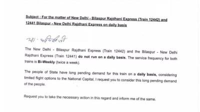रायपुर। छत्तीसगढ़ की राजधानी और उत्तर भारत के बीच बेहतर रेल कनेक्टिविटी सुनिश्चित करने के उद्देश्य से बिलासपुर–नई दिल्ली राजधानी एक्सप्रेस (12441/12442) को प्रतिदिन संचालित करने की मांग की गई...