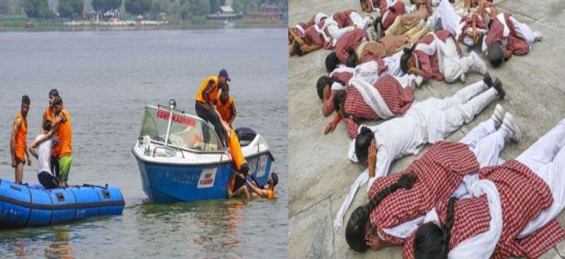 जम्मू के एक स्कूल में छात्रों को मॉक ड्रिल अभ्यास के दौरान किसी भी स्थिति से निपटने के लिए प्रशिक्षित किया जा रहा है।