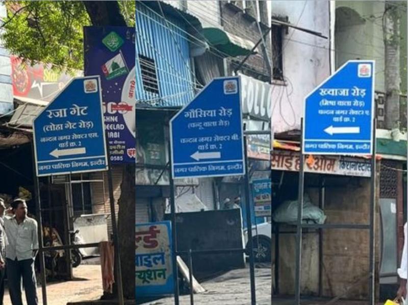 इंदौरः जिले के चंदन नगर क्षेत्र में बिना अनुमति के लगे धर्म विशेष के बोर्डों को लेकर विवाद गहराता जा रहा है। यहां स्थानीय पार्षद द्वारा गलियों और सड़कों के नाम बदलकर नए बोर्ड लगाए गए थे। इनकी तस्वीरें सोशल मीडिया पर वायरल होते ही मामला सियासी रंग ले बैठा। दरअसल, पार्षद फातमा रफीक ख़ान द्वारा नगर निगम की अनुमति लिए बिना ही गोसिया रोड, सकीना मंजिल, रजा गेट और ख्वाजा गेट नाम से बोर्ड लगाए गए थे। यह कार्रवाई निगम की अनुमति और एमआईसी के प्रस्ताव के बिना की गई थी