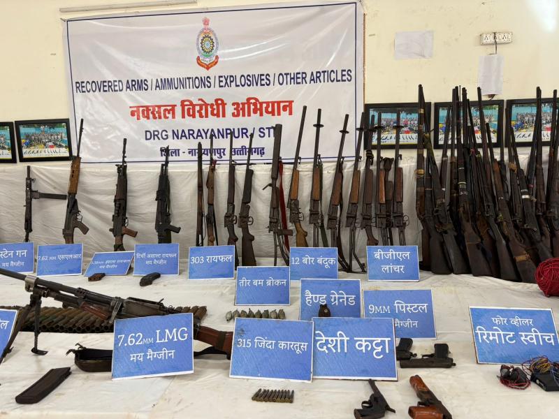 नारायणपुर थाना कोहकामेटा क्षेत्र में DRG, STF और ITBP की संयुक्त कार्रवाई में LMG, AK-47, इंसास, SLR और स्टेन गन जैसे अत्याधुनिक हथियार जब्त किए गए।