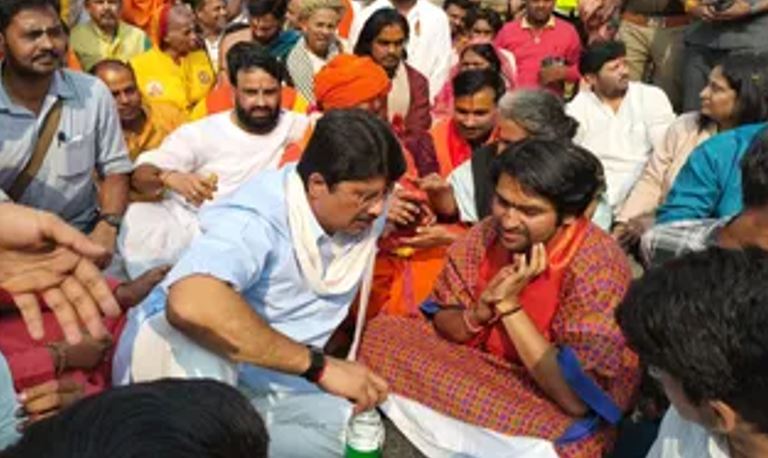 बागेश्वर धाम के पीठाधीश्वर धीरेंद्र कृष्ण शास्त्री की सनातन एकता पदयात्रा मथुरा पहुंच चुकी है। शुक्रवार को पदयात्रा के दौरान जनसत्ता दल लोकतांत्रिक के अध्यक्ष रघुराज प्रताप सिंह राजा भैया धीरेंद्र शास्त्री का हाथ पकड़कर चलते दिखे। दोनों ने हाथ उठाकर जयकारे भी लगाए। सड़क पर बैठकर पत्तल में पूड़ी-सब्जी खाई। इस बार की यात्रा में उनके दोनों पुत्र कुंवर शिवराज प्रताप सिंह और कुंवर बृजराज प्रताप सिंह भी साथ रहे। यात्रा स्थल पर एमएलसी कुंवर अक्षय प्रताप सिंह सहित बड़ी संख्या में समर्थक मौजूद रहे