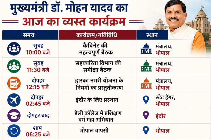 महत्वपूर्ण नीतियां: बैठक में नई तबादला नीति, किसानों के गेहूं उपार्जन और सिंहस्थ 2028 की तैयारियों की समीक्षा होने की संभावना है। इंदौर से जुड़ी सिंचाई परियोजनाओं पर भी बड़े फैसले लिए जा सकते हैं।