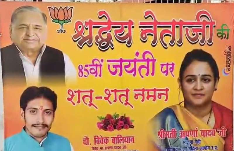 लखनऊ। यूपी में 20 नवंबर को उपचुनाव की वोटिंग है। सोमवार को प्रचार का आखिरी दिन है। रविवार को लखनऊ में सियासत की नई तस्वीर दिखी। प्रदेश भाजपा कार्यालय के मुख्य द्वार पर मुलायम सिंह यादव की बड़ी होर्डिंग लगी नजर आई। इसमें अपर्णा यादव की फोटो भी थी। अपर्णा मुलायम की छोटी बहू हैं।